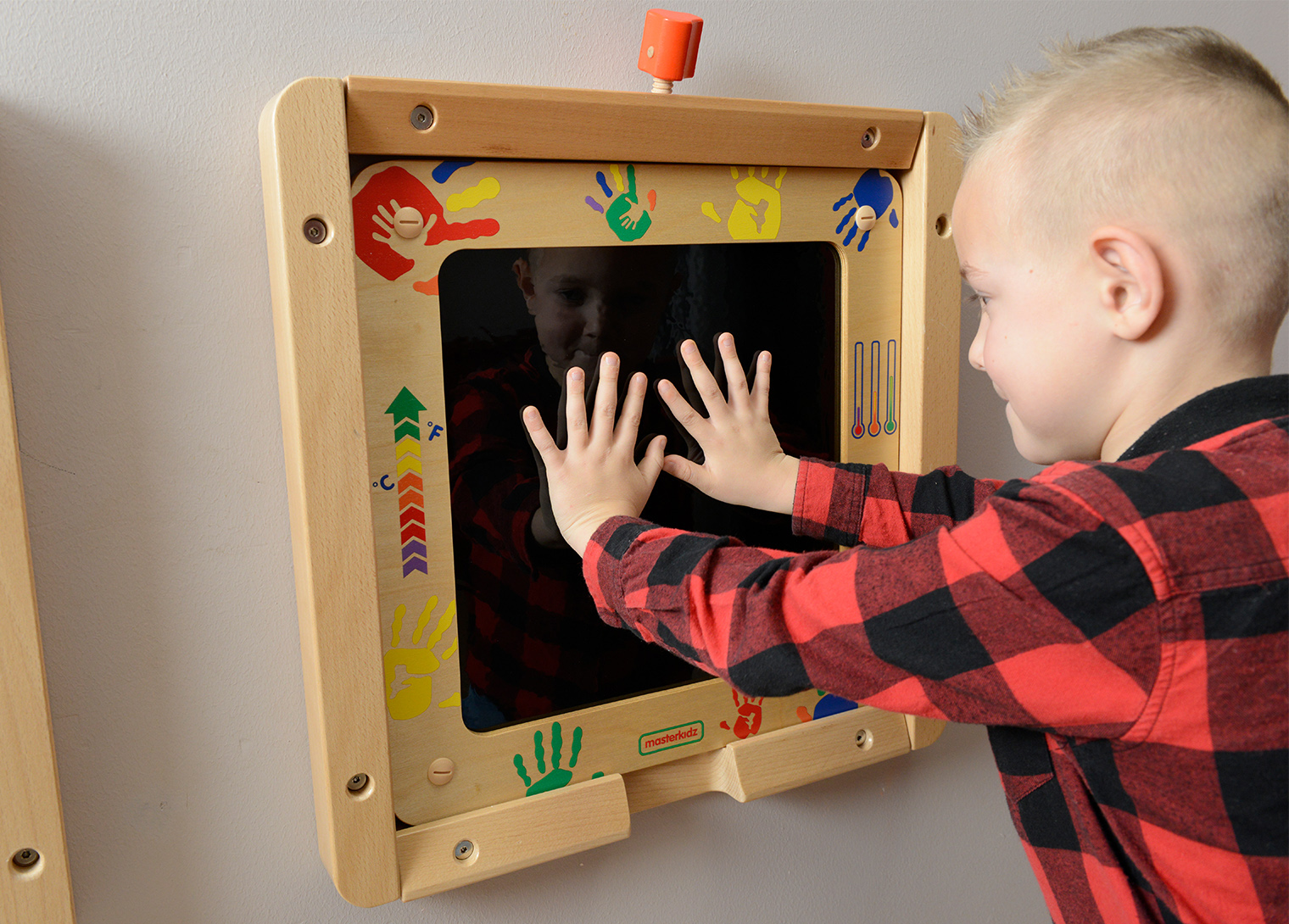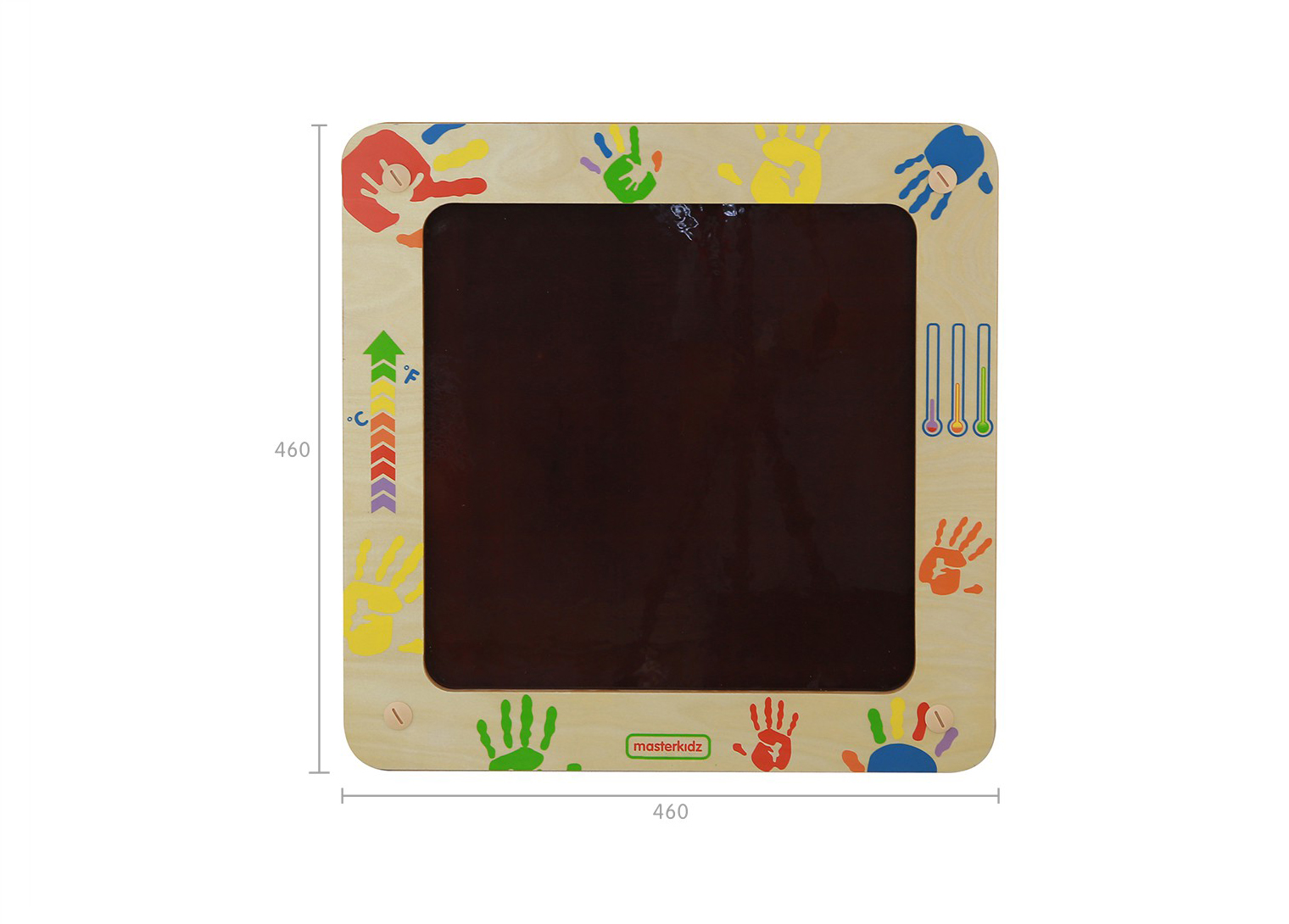 The Heat Sensitive Fun Board has a dark special plastic film fitted to its surface. When children place their warm hands on it and then remove them, they will discover that a colourful handprint has appeared. The hotter their hands the clearer the handprint. Different colours appear depending upon the heat being transferred. For a quicker response, children can heat their hands on a water bottle filled with warm water. This will transmit the heat more efficiently to the surface and the colour changes will be more rapid and vivid as a result.