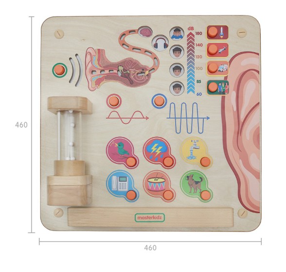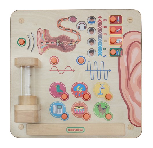 Our sense of hearing is explored in some depth using this interactive Learning Board. Sound travels as invisible waves through the air but these can be observed as the sound vibrations hit the tiny beads in a clear tube on the front of the board. Buttons allow the child to explore various features of sound too including volume, pitch and the variety of sounds we can identify such as a dog barking, birds singing and water running. A view is given of the inner ear and the way sounds are collected and the tiny vibrations sent as messages to the brain to identify. When sounds get too loud, the board shows us the need to protect our ears by wearing ear defenders.
