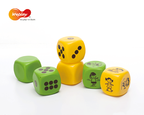 The Weplay Super Dice is a big dice made for kids. It comes with number dots, activities on the sides dice. There is also 2 dices that you can create and draw on. Made in Taiwan.